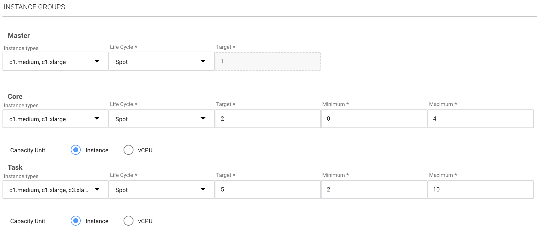 • Instance Types: Choose one or more preferred instance types for the core.