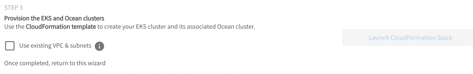 1. Connect your workstation to the EKS cluster by copying the command shown in Step 4 of the Create page and running it in your command-line interface. Note that the command must include the Ocean Cluster Name that you entered previously.
